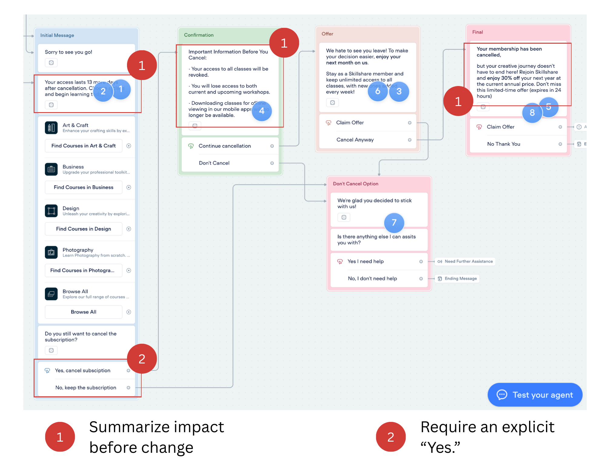 Summarize impact before change (dates, access, next charge) and require an explicit “Yes.”